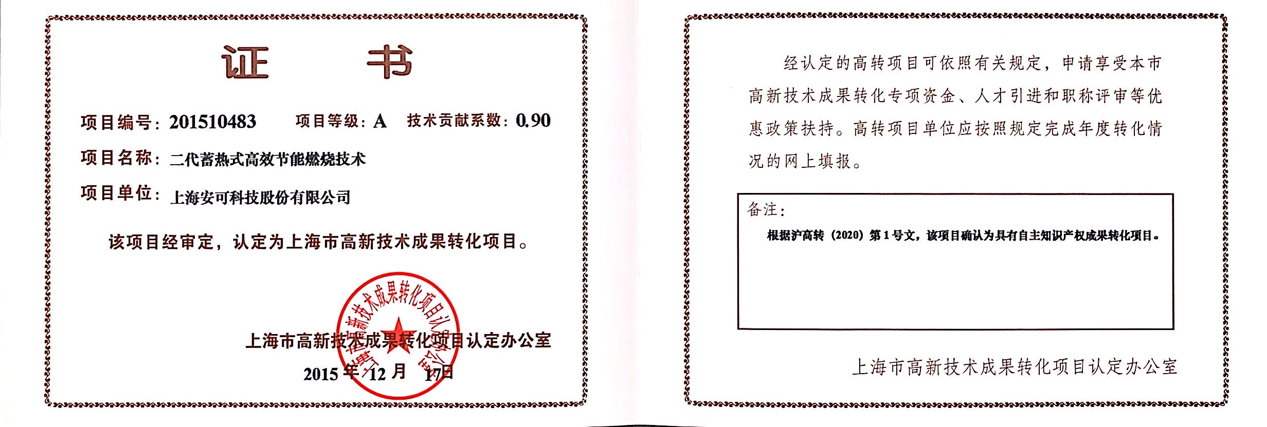 高新技术成果转化证书(二代蓄热式高效节能燃烧技术A)
