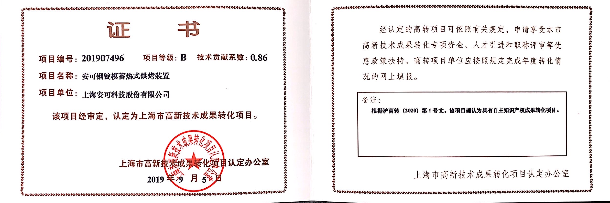 高新技术成果转化证书(安可钢锭磨蓄热式烘烤装置B)